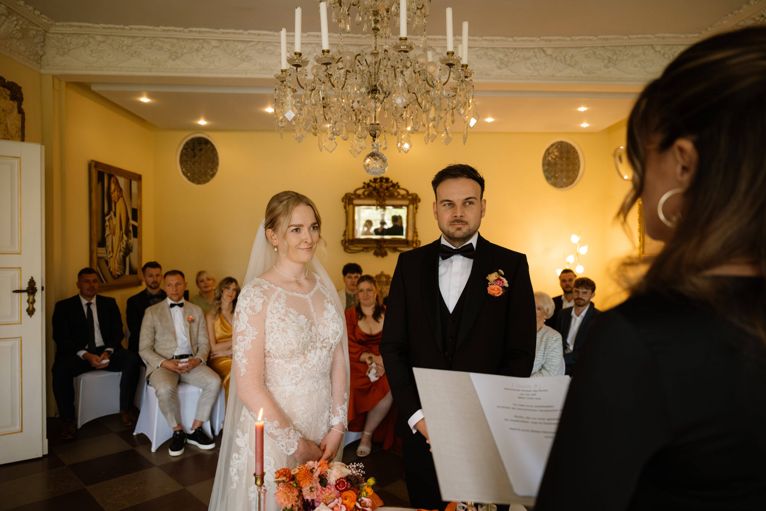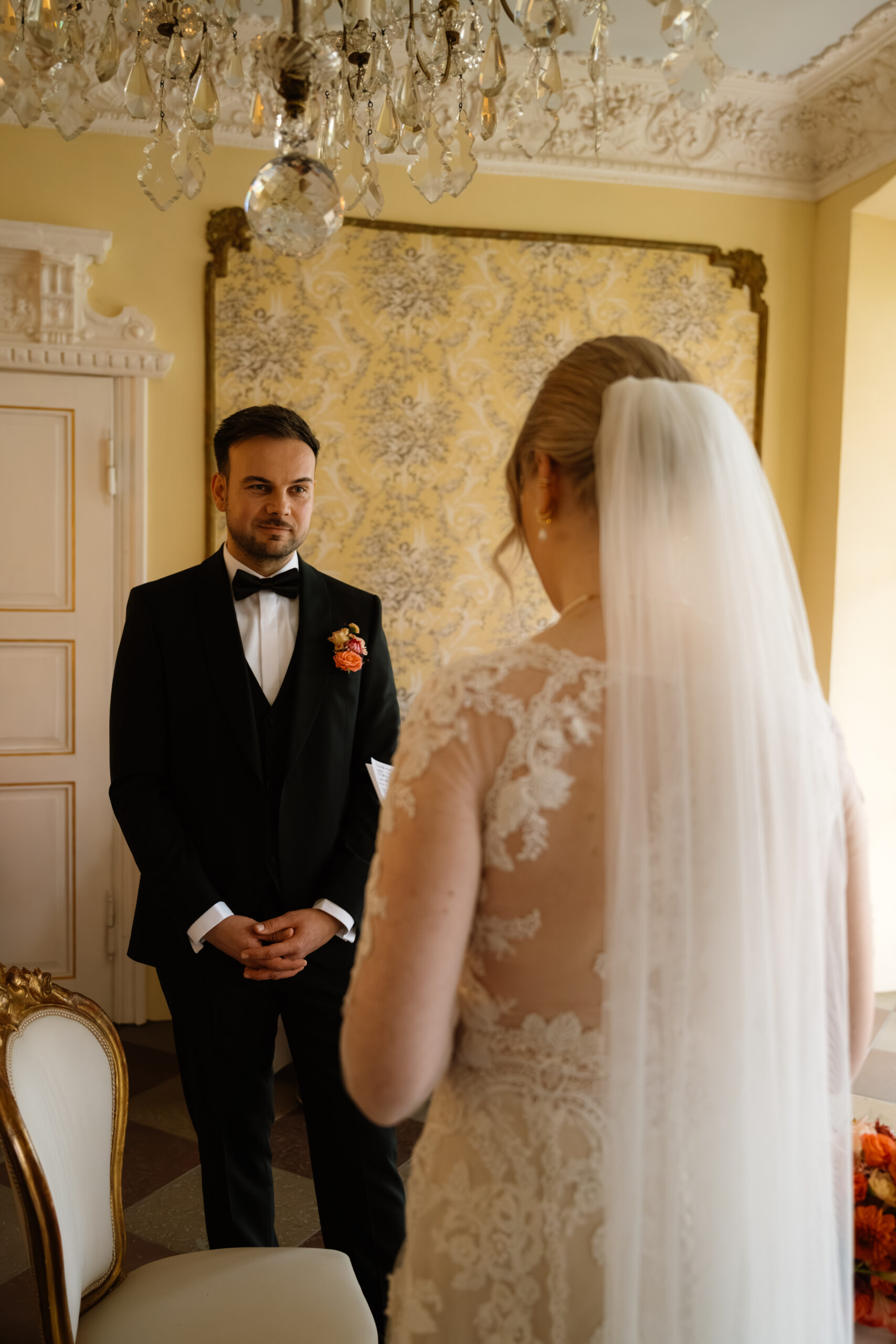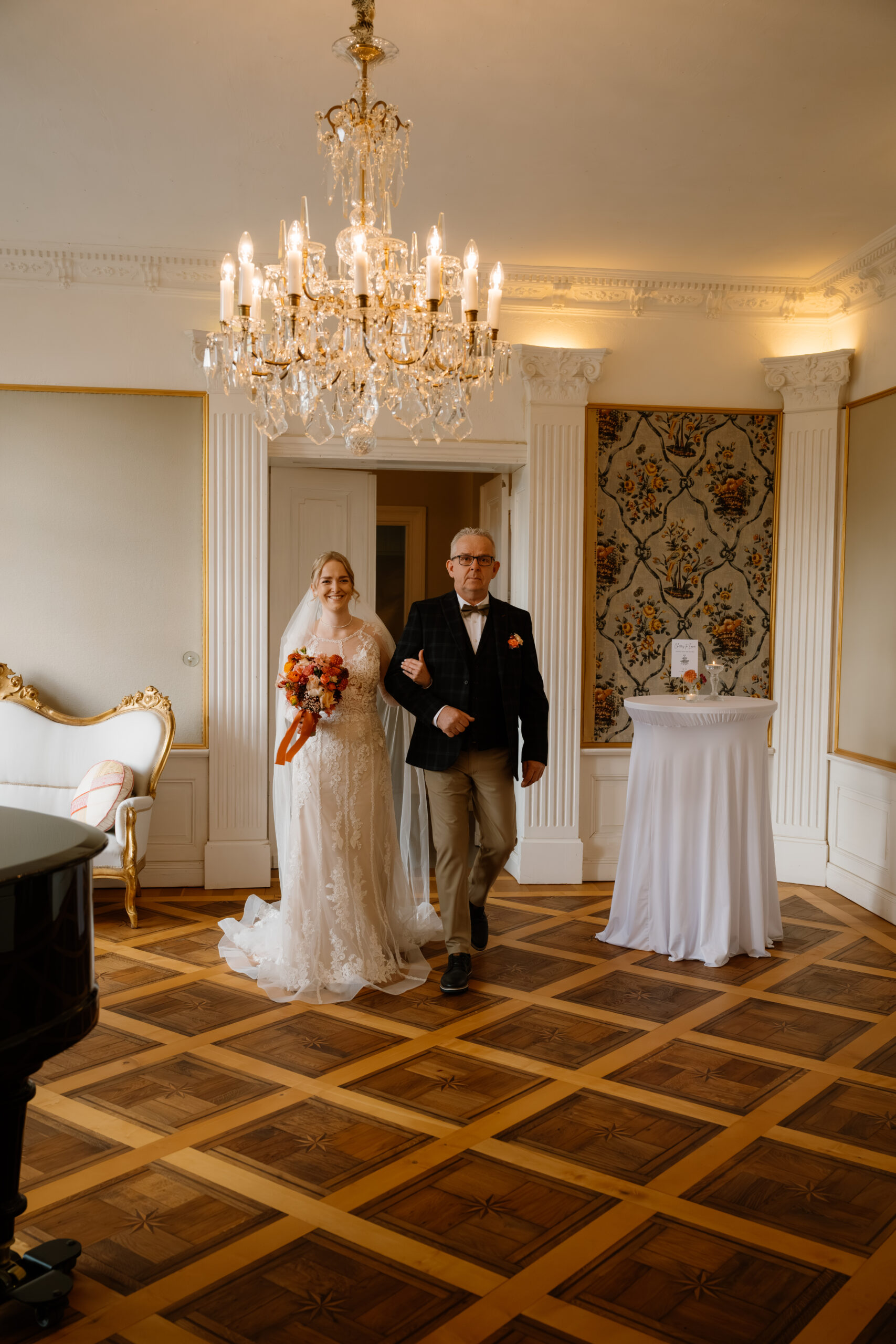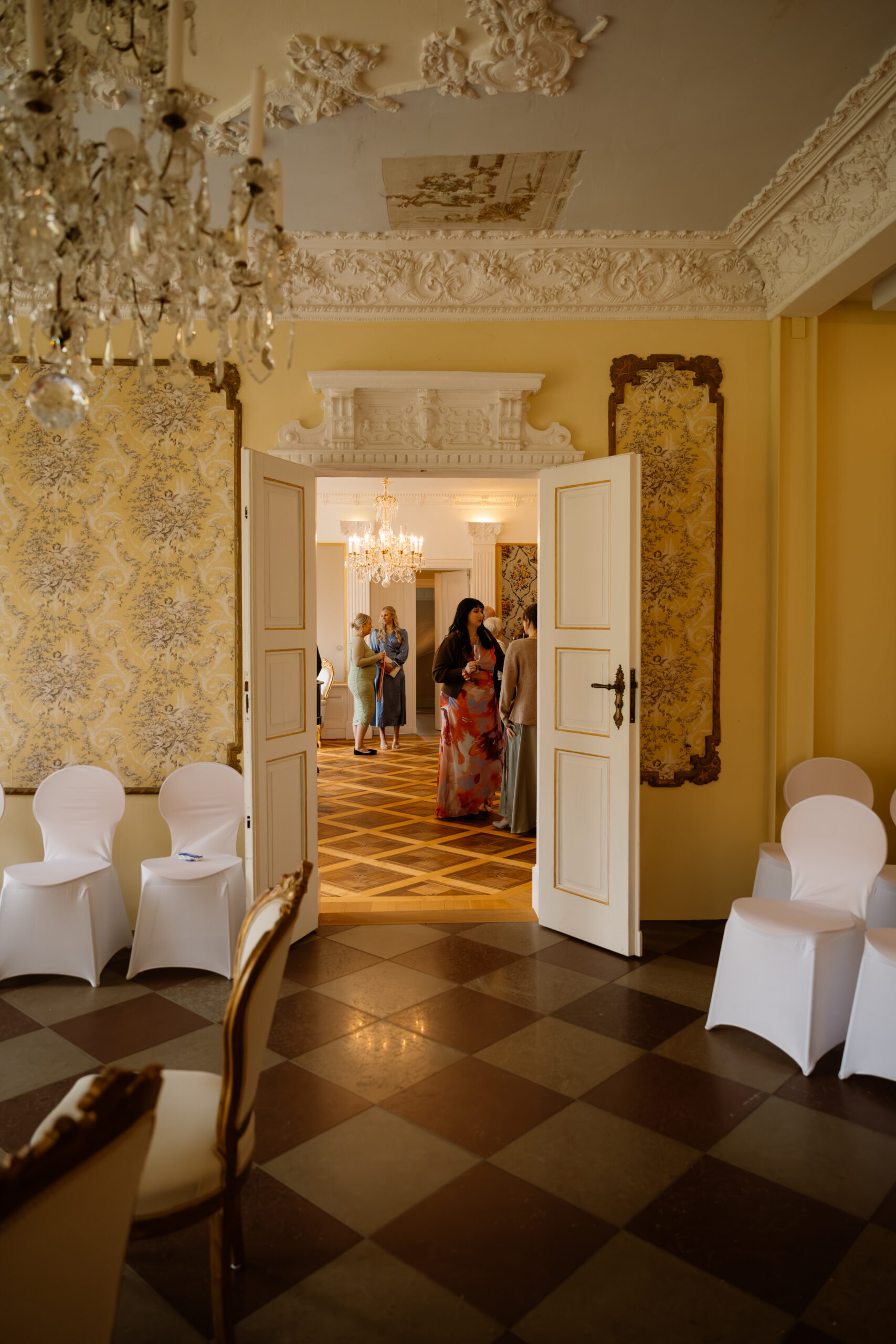Für eine Trauung ist das Schloss auch super flexibel: Es gibt z. B. Räume wie Kaminzimmer oder Gartenzimmer mit Blick ins Grüne (jeweils bis zu ca. 30 Sitzplätze) – das fühlt sich privat an, aber trotzdem festlich.
